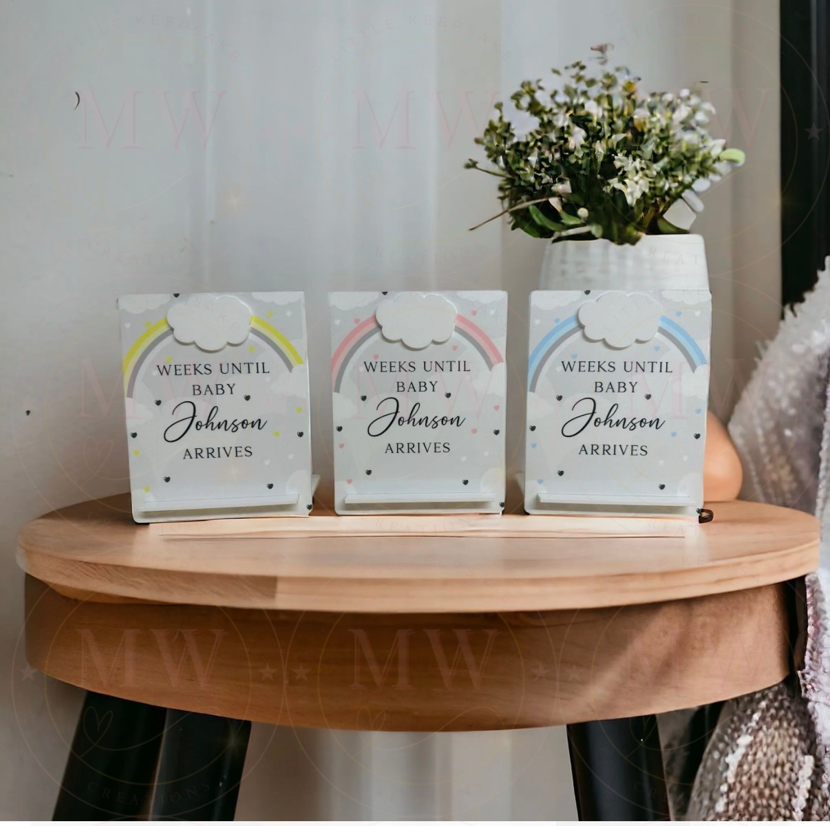 Count down to baby’s arrival with this beautiful count down board. The acrylic cloud can be used to add the count down to your bundle of joy!